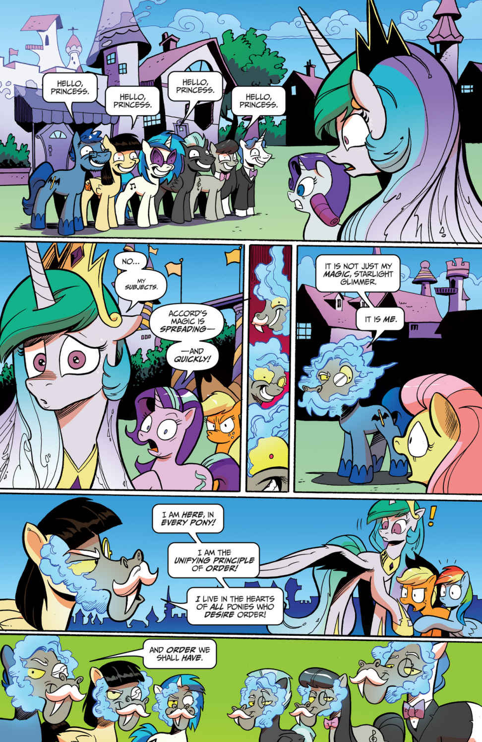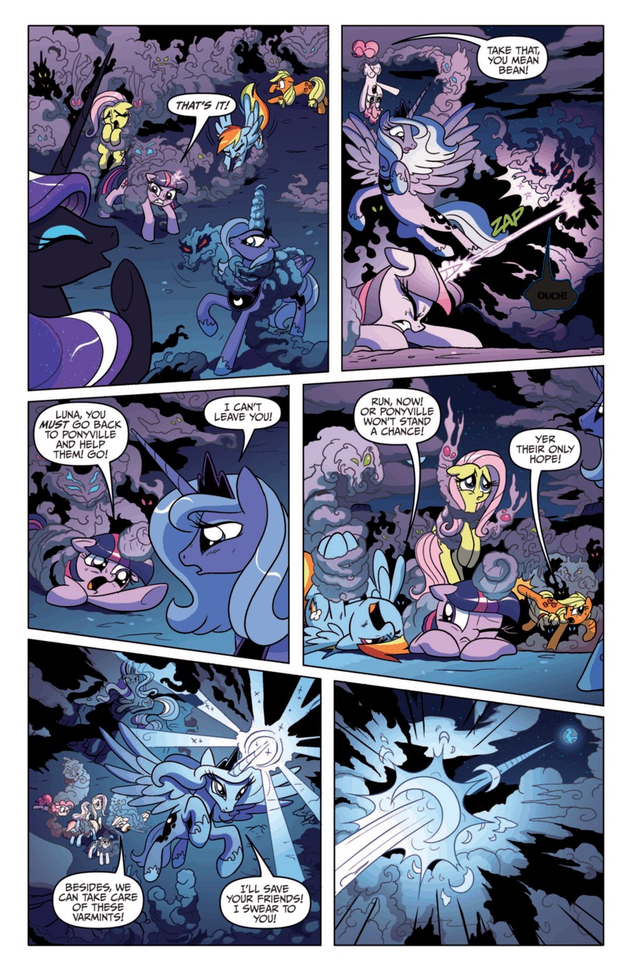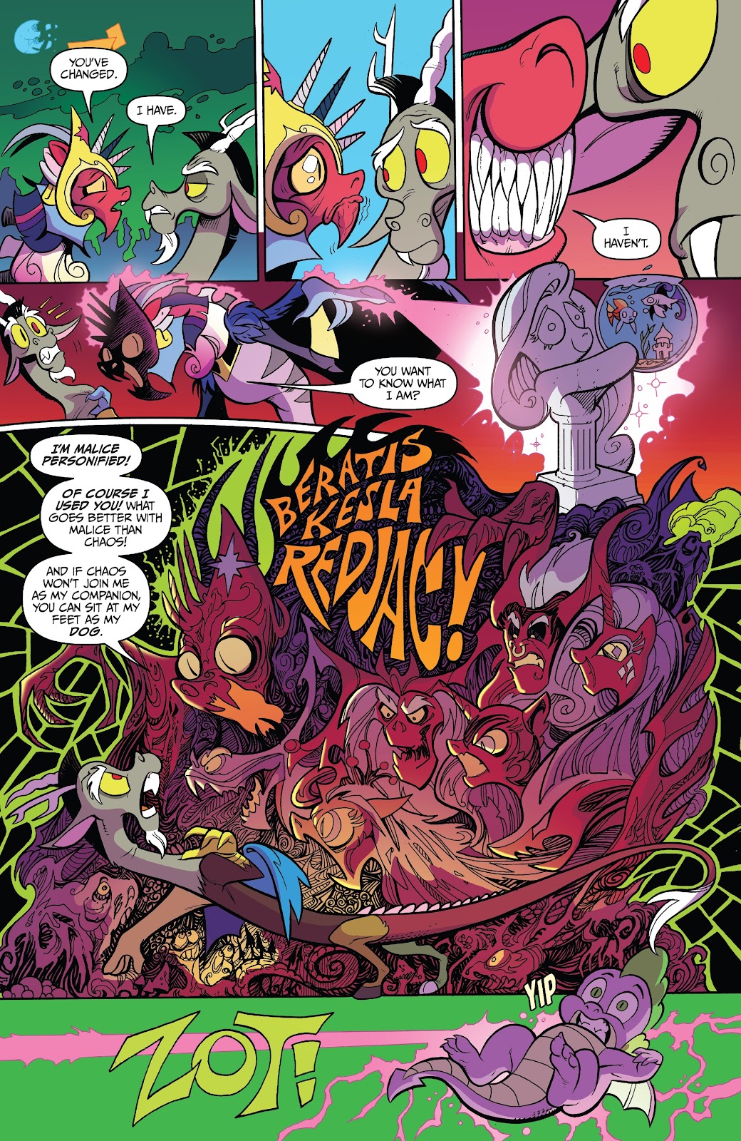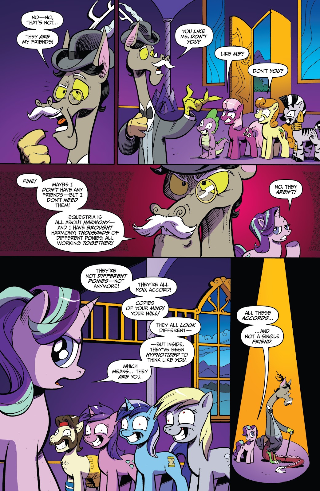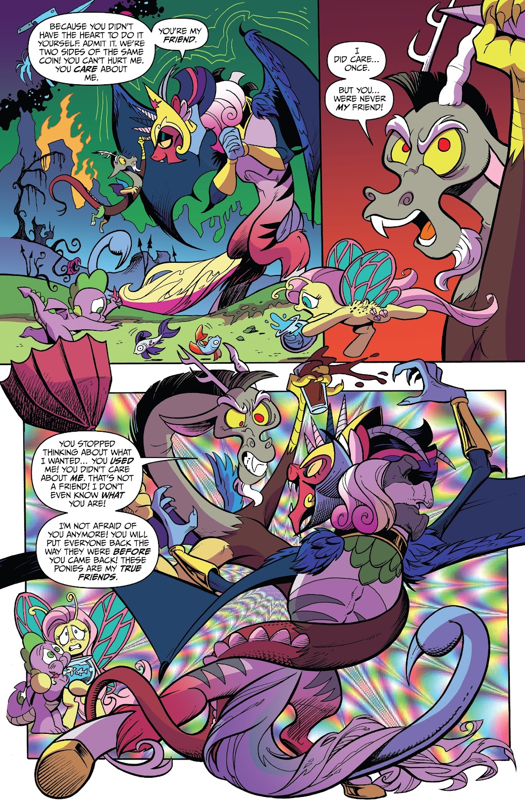 (“I’m not afraid of you anymore! You will turn everyone back the way they were before you came back! These ponies are my true friends.”)