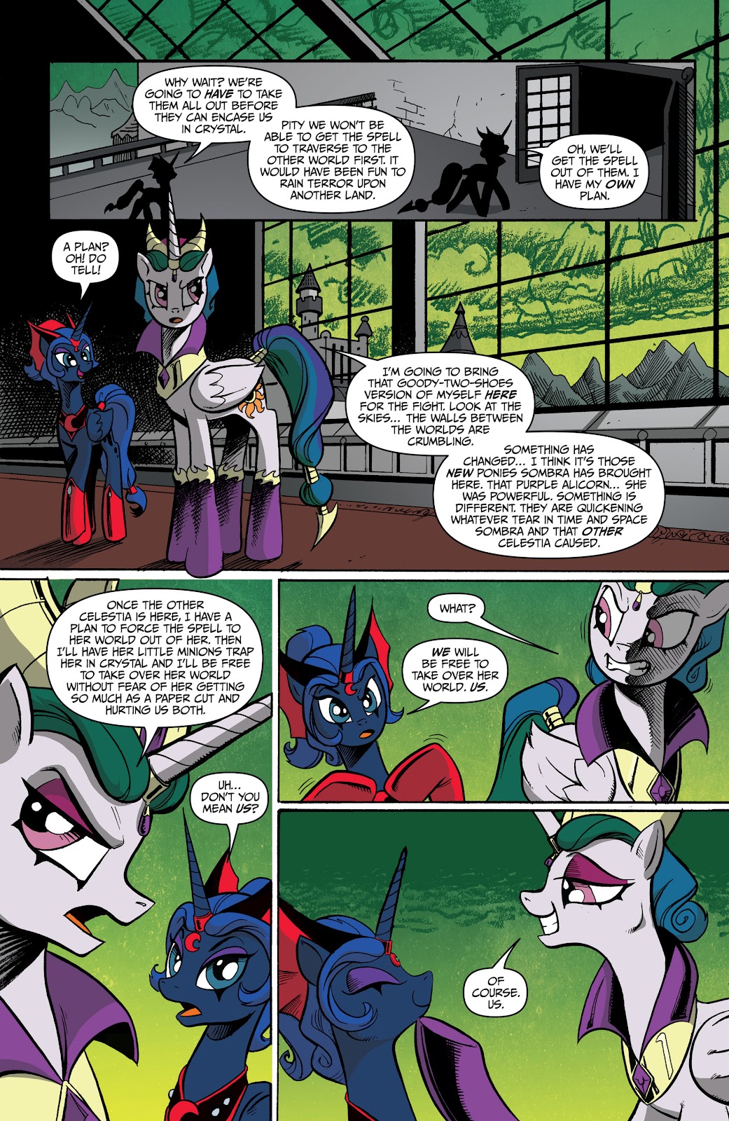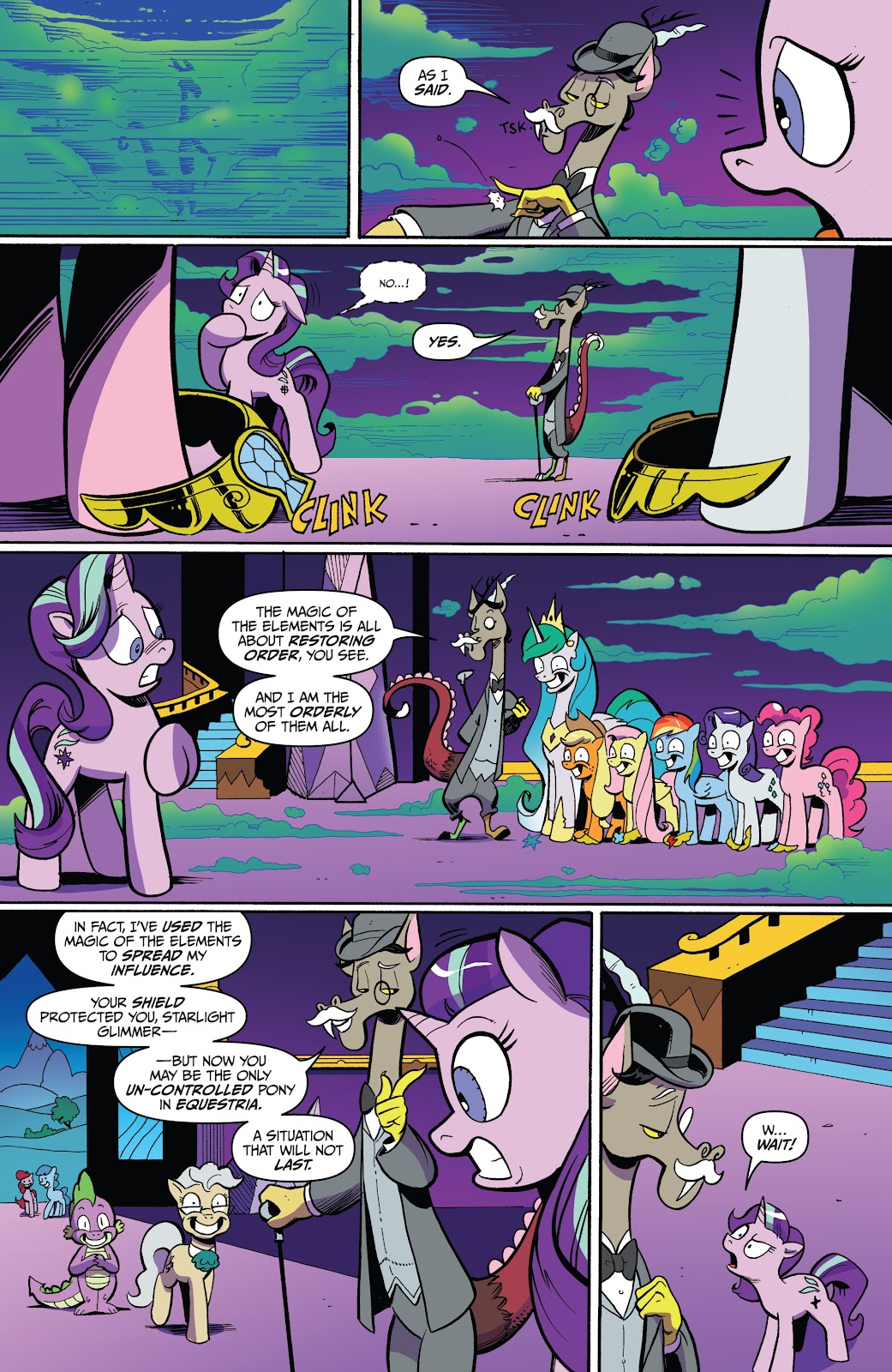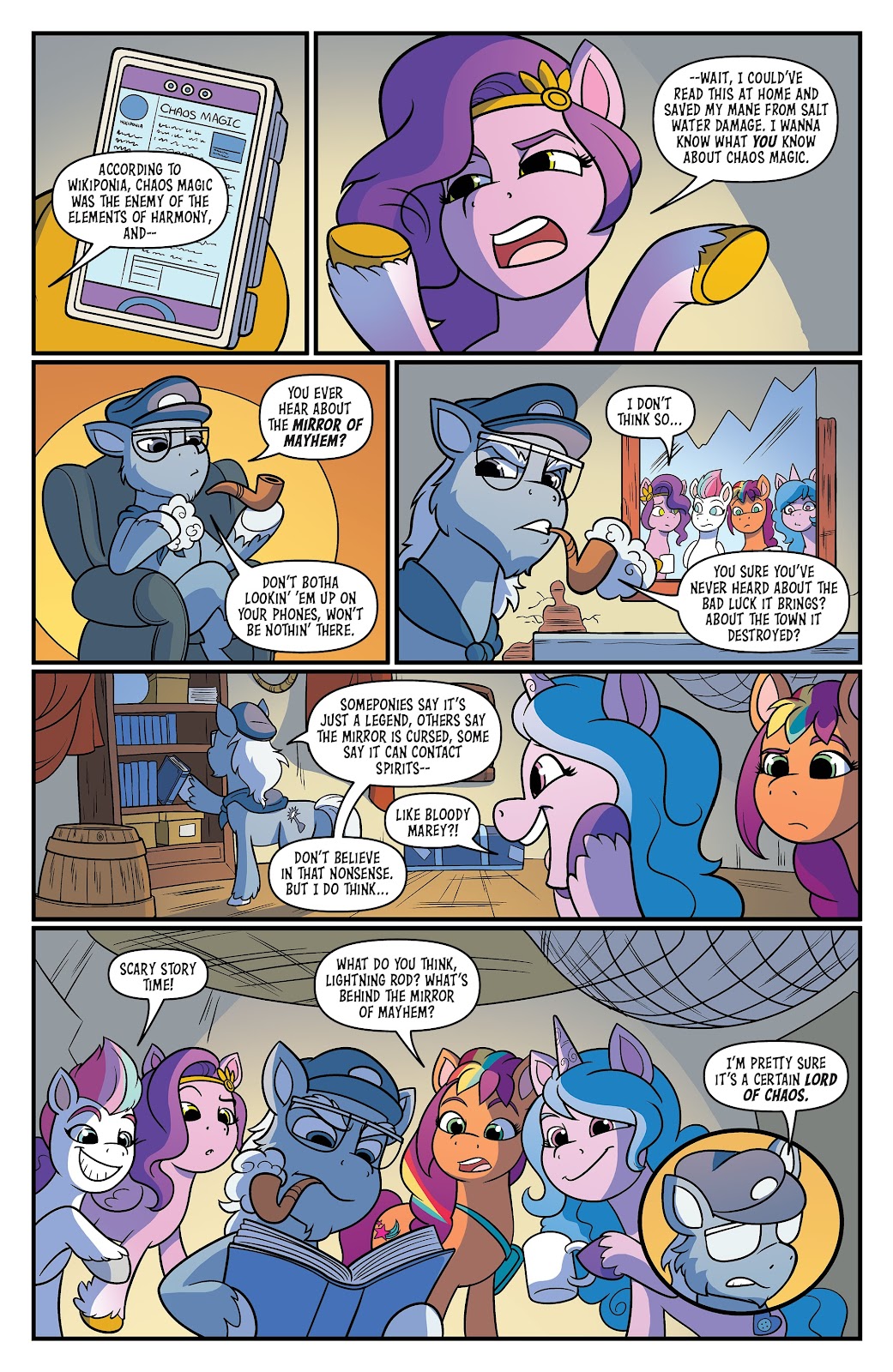 Intelligence: Intelligence would be high since he knows the math and technical science to create his time machine; the RPG feat of him having eyes and ears everywhere and having heard and seen everything ever said should be good enough to say that he can replicate any kind of knowledge reality has to offer, past, present, and future. This includes all spells shown and all math and science created. He's deceived entire nations into going to war with each other (Season 10 comics), and can manipulate ponies into betraying their nature.