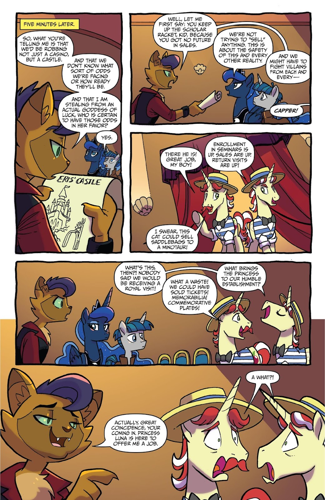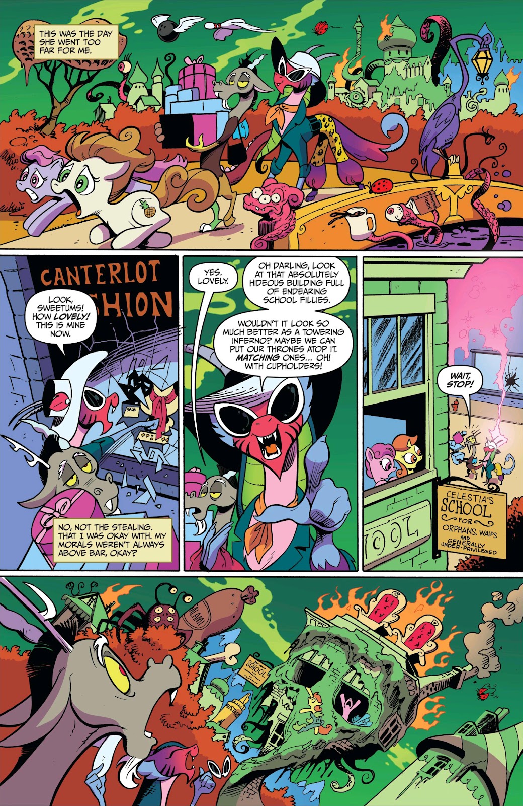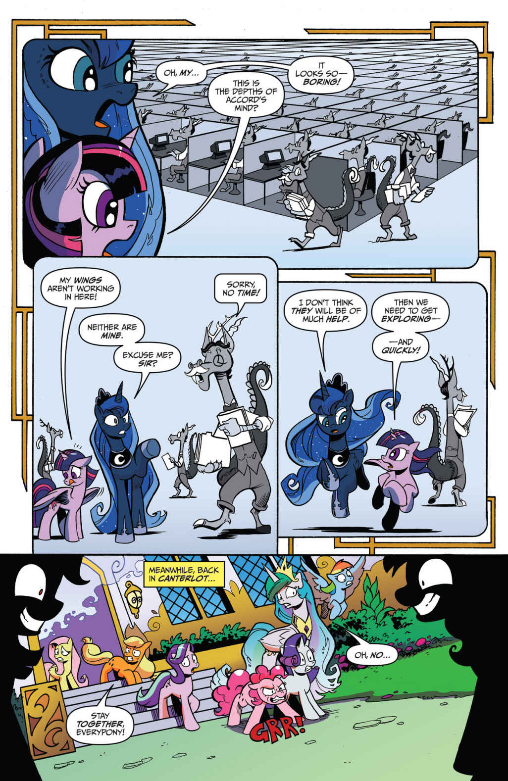 Intelligence: Intelligence would be high since he knows the math and technical science to create his time machine; the RPG feat of him having eyes and ears everywhere and having heard and seen everything ever said should be good enough to say that he can replicate any kind of knowledge reality has to offer, past, present, and future. This includes all spells shown and all math and science created. He's deceived entire nations into going to war with each other (Season 10 comics), and can manipulate ponies into betraying their nature.
