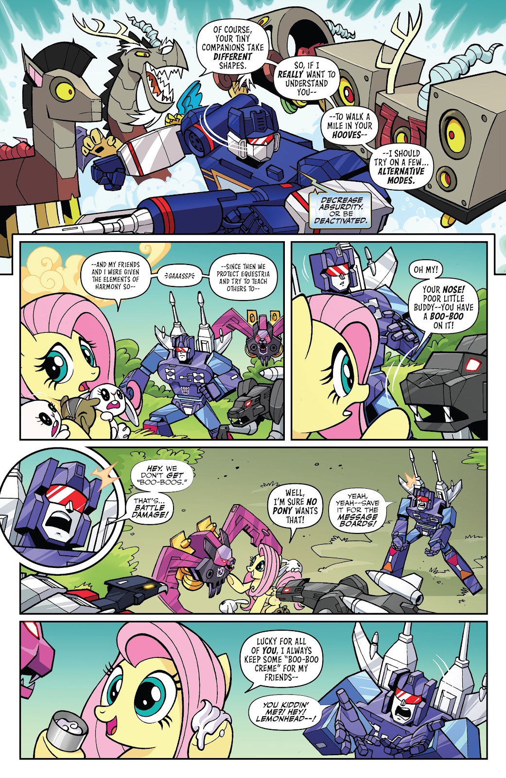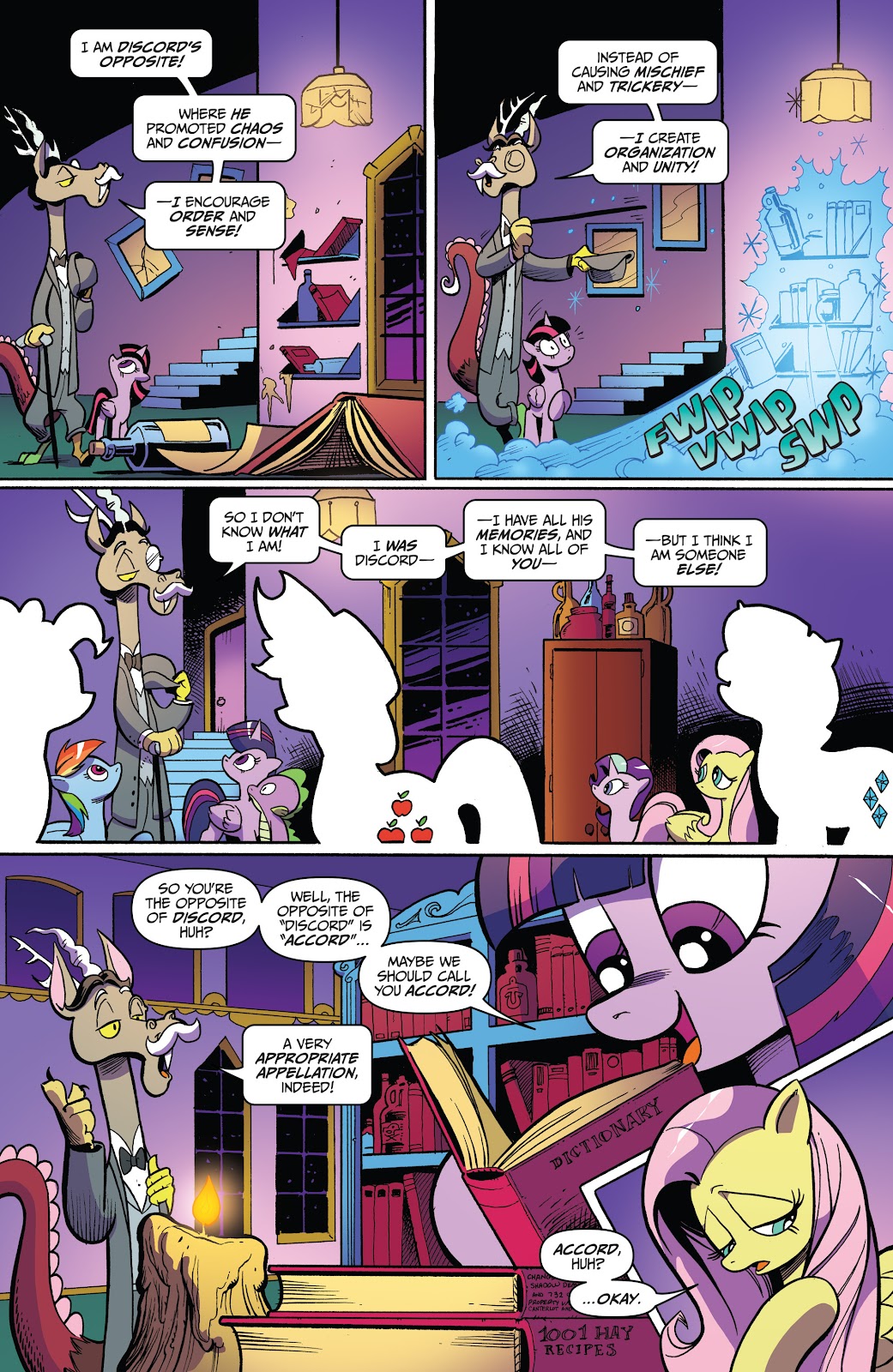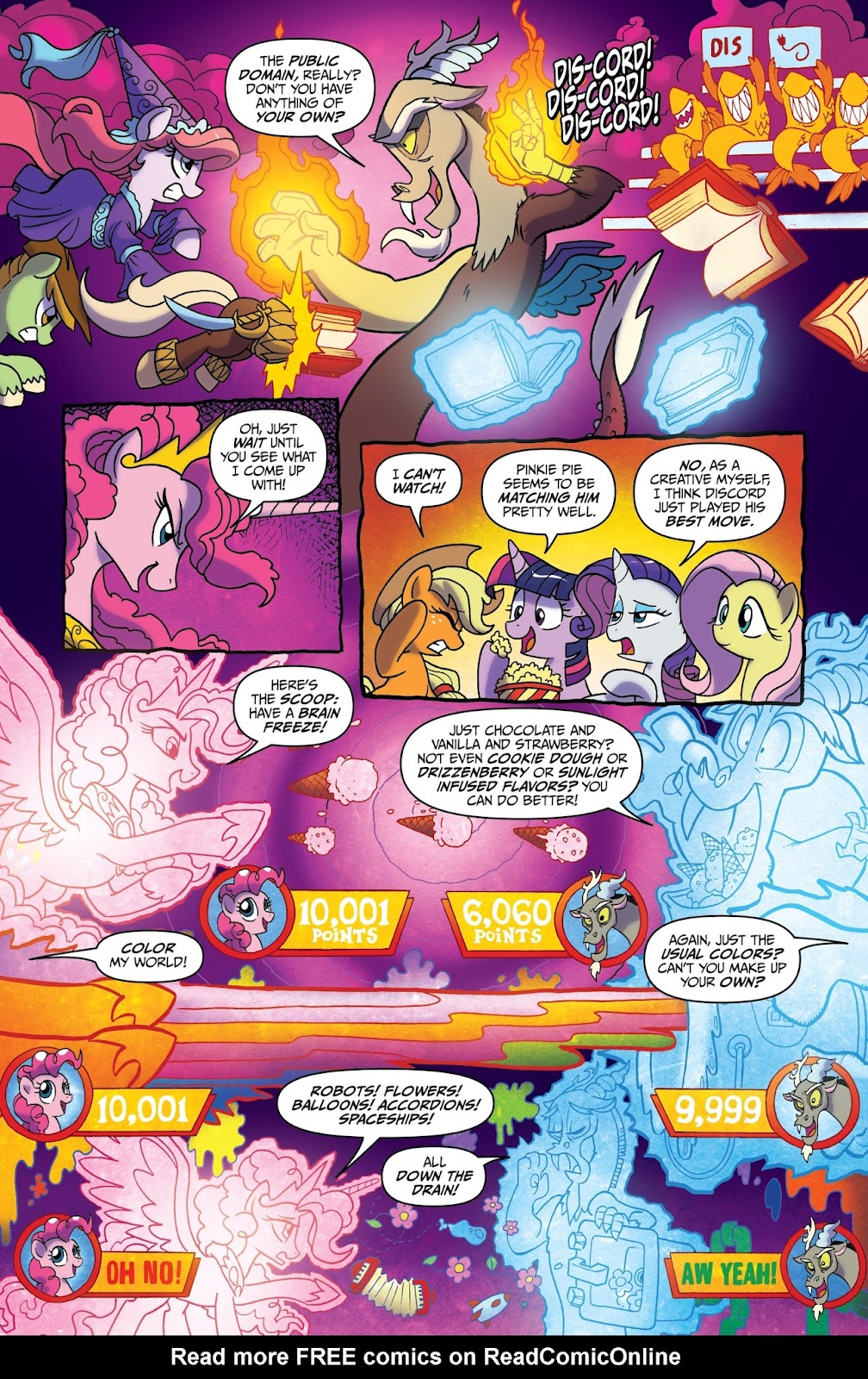 Speed: Discord likely scales to immeasurable speed through multiple different feats and characters. His travel speed scales to his combat and reaction speed, since he reacted to Cosmos tearing through the space-time of Limbo and his realm to get to his home; and there's no reason to assume his energy beams and other magical abilities aren't at least the same speed as his flying, since it's all coming from his magic which is a life-force that is necessary for all of his abilities. He also once flew so fast he went back a week in time, which should be immeasurable in nature. Discord should also scale above the Pony of Shadows who was able to absorb all of the light in the sky, and was going to physically go to every reality and destroy them. His speed should be above Celestia’s dream wave, which was able to affect multiple dreams at the same time across Equestria.