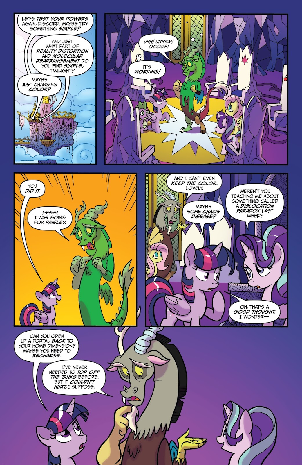 Stamina: His stamina should be infinite. He can keep fighting so long as he creates chaos or there is chaos around him, and it's stated in the season 10 comics that he's never needed to go back to his realm to "top-up" on magic. He was able to beat Pinkie Pie in a Cuckoo Cook-Off without getting tired out, and she had the power of his chaos dimension on her side.