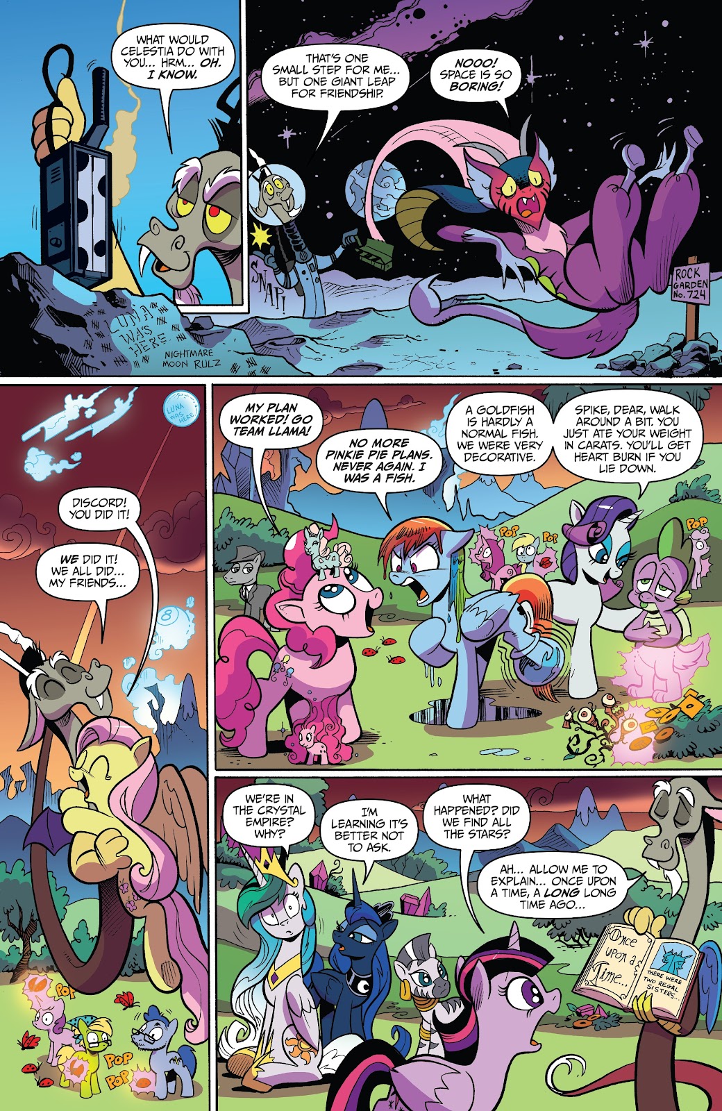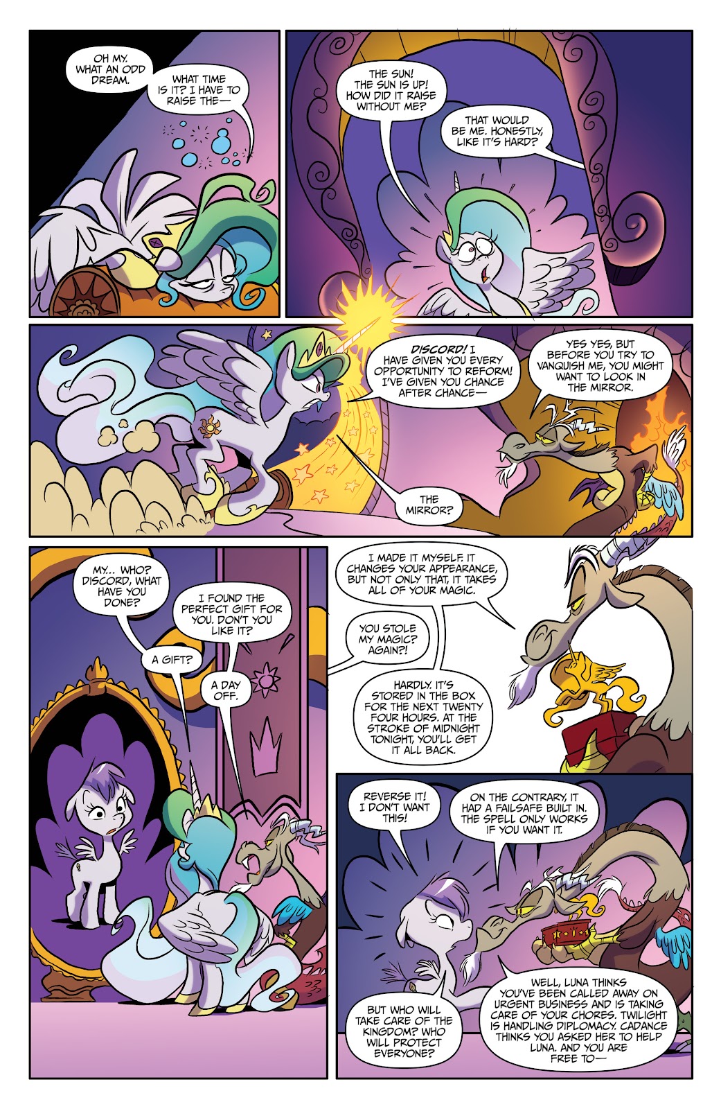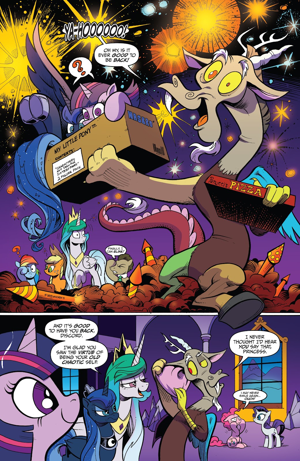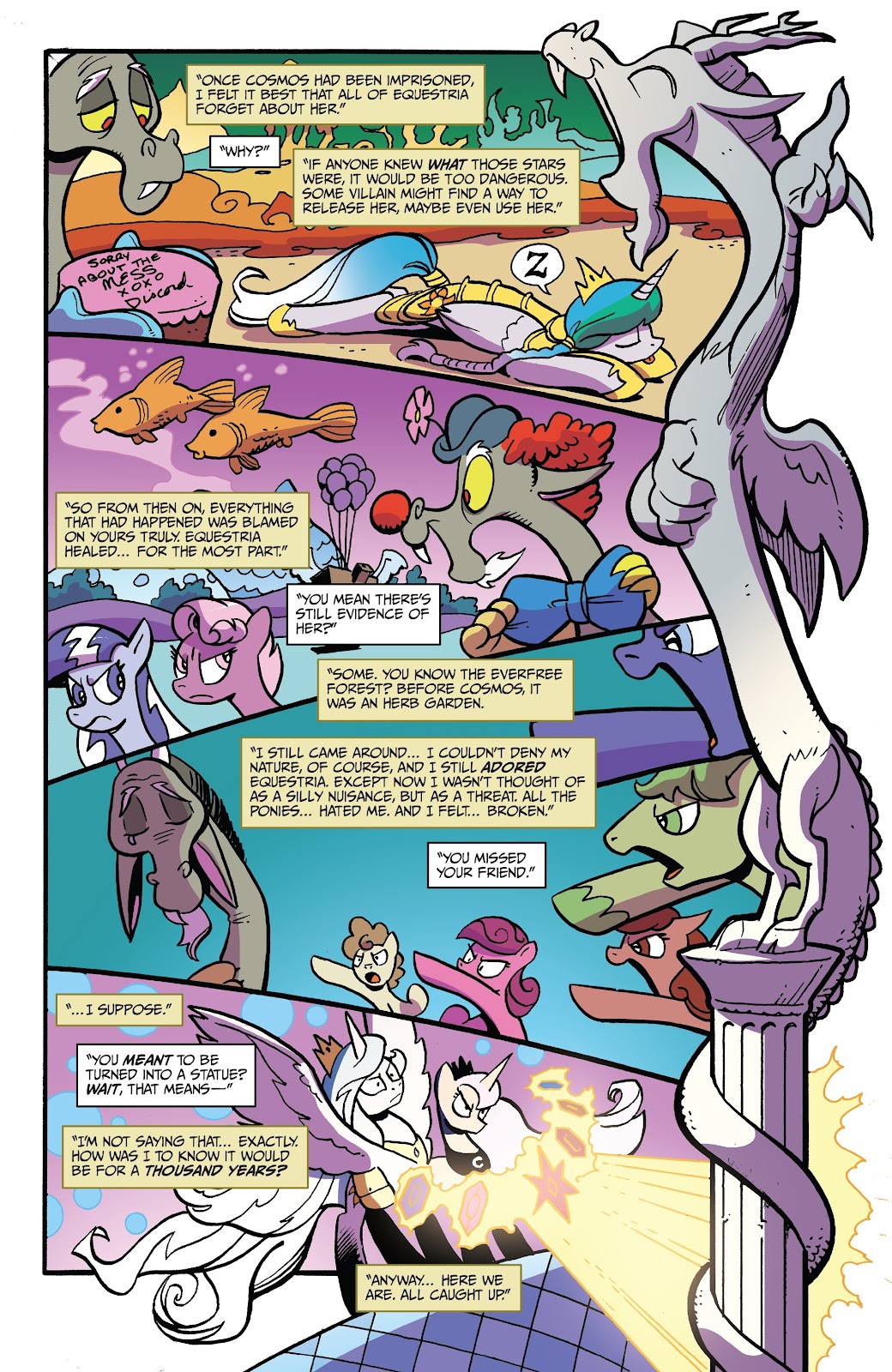 Over time, Discord was largely forgotten. Eventually, Celestia stood as the last of the ancient legends to rule over Equestria, raising a new generation of heroes to wield the Elements of Harmony. Led by Celestia’s own pupil Twilight Sparkle, the Elements of Harmony would gain new bearers. And just in time, for Discord would soon escape his stone confinements at long last to unleash chaos upon all life once again. But try as he might, even when he managed to break the bearers of the Elements apart and crush their friendships, it was all for naught. Celestia had thought ahead, and Twilight Sparkle succeeded in righting his wrongs. Discord was defeated, and returned to his stone prison by the magic of friendship.