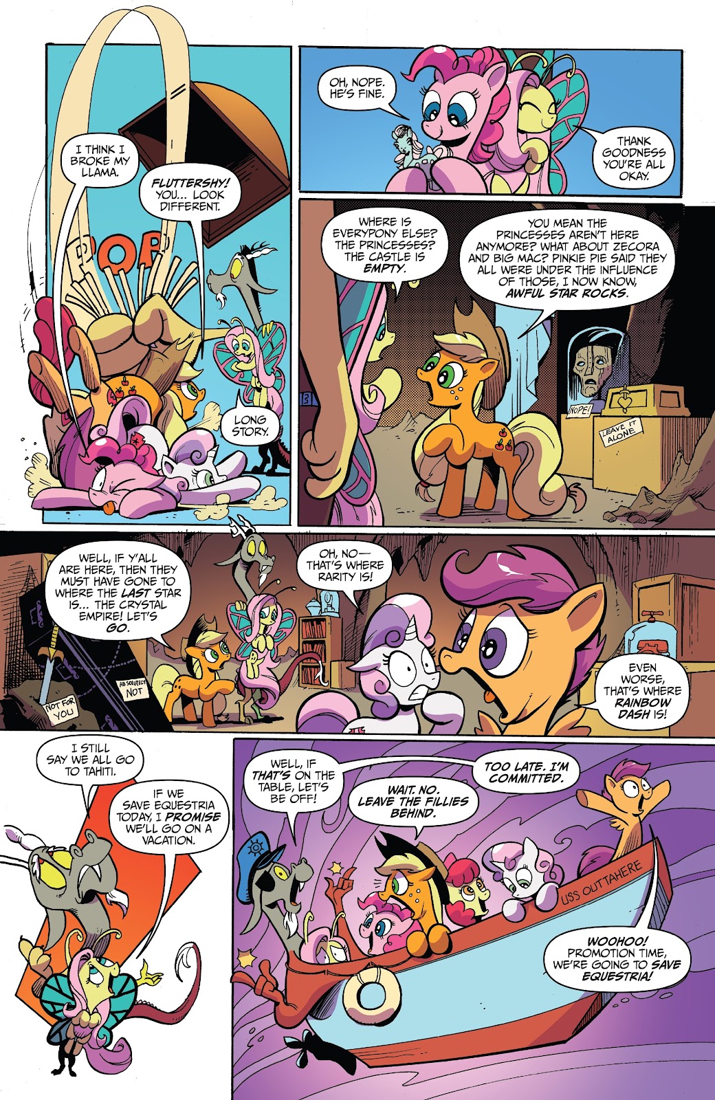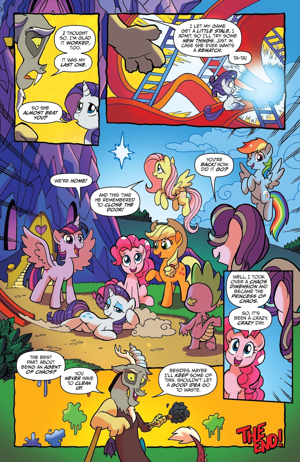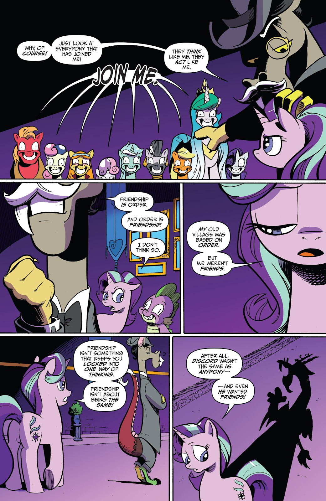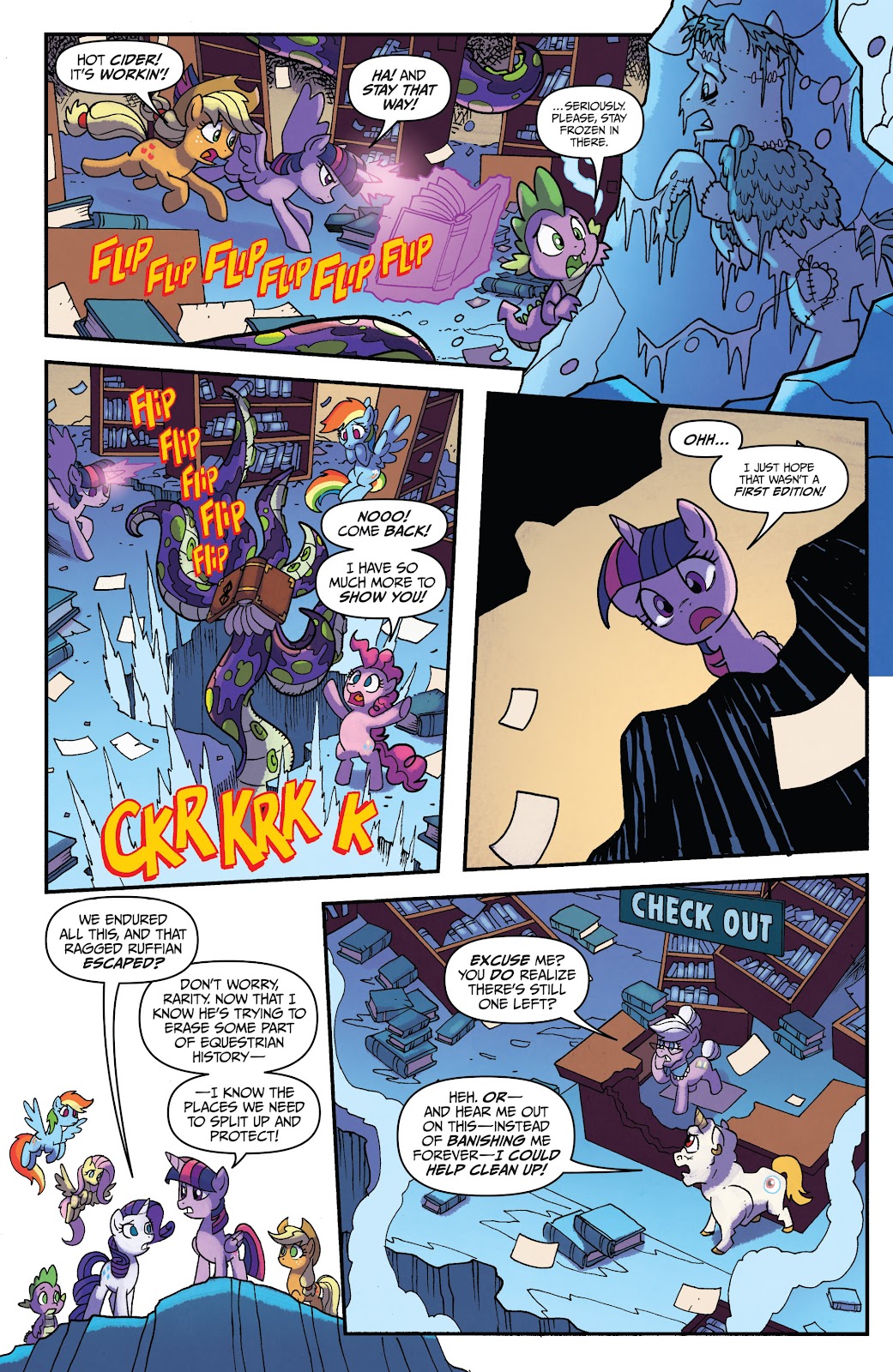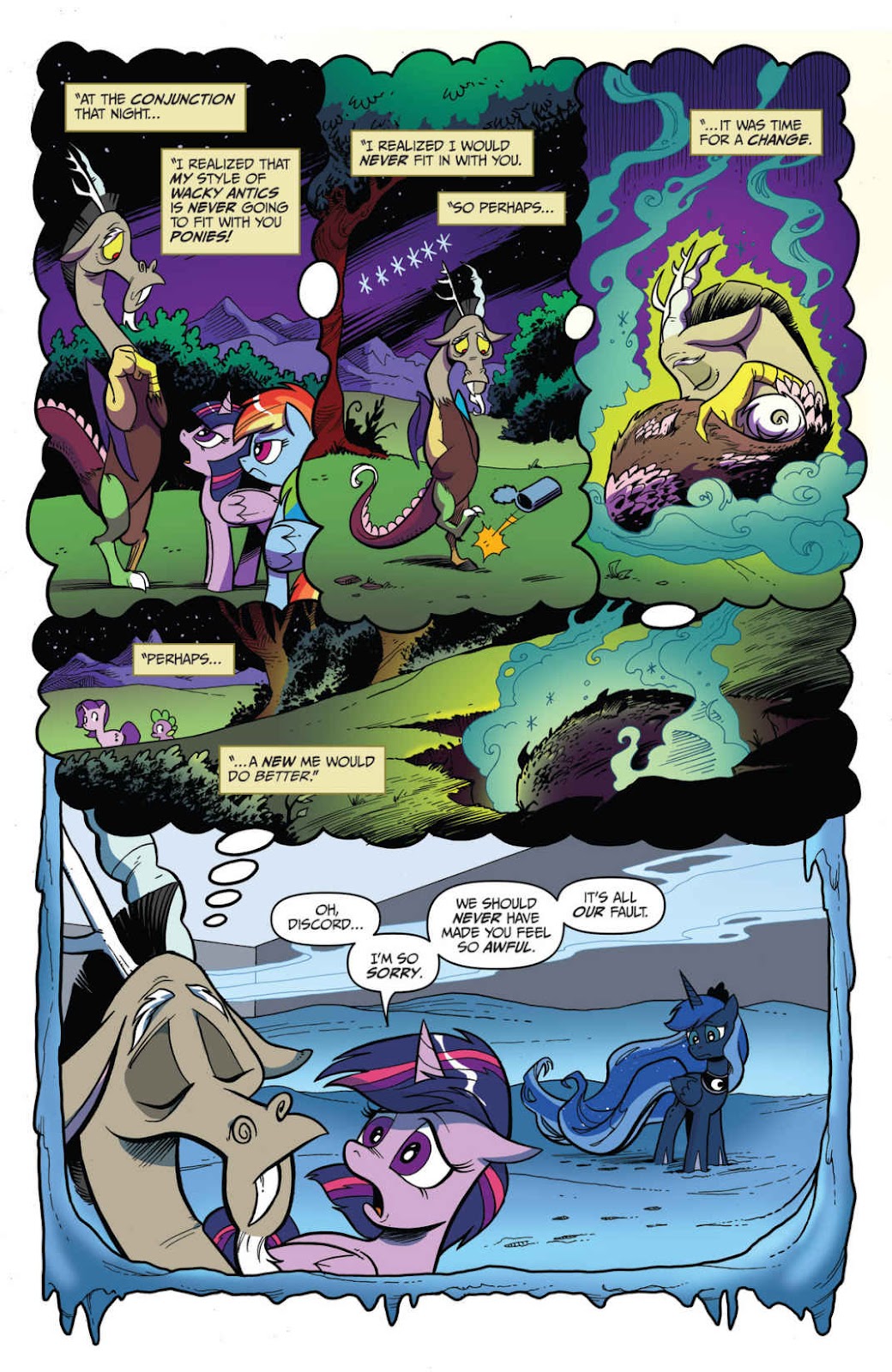 Over time, Discord was largely forgotten. Eventually, Celestia stood as the last of the ancient legends to rule over Equestria, raising a new generation of heroes to wield the Elements of Harmony. Led by Celestia’s own pupil Twilight Sparkle, the Elements of Harmony would gain new bearers. And just in time, for Discord would soon escape his stone confinements at long last to unleash chaos upon all life once again. But try as he might, even when he managed to break the bearers of the Elements apart and crush their friendships, it was all for naught. Celestia had thought ahead, and Twilight Sparkle succeeded in righting his wrongs. Discord was defeated, and returned to his stone prison by the magic of friendship.