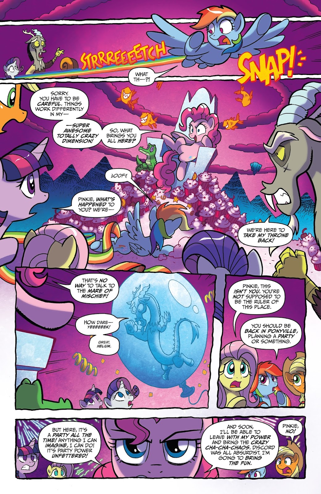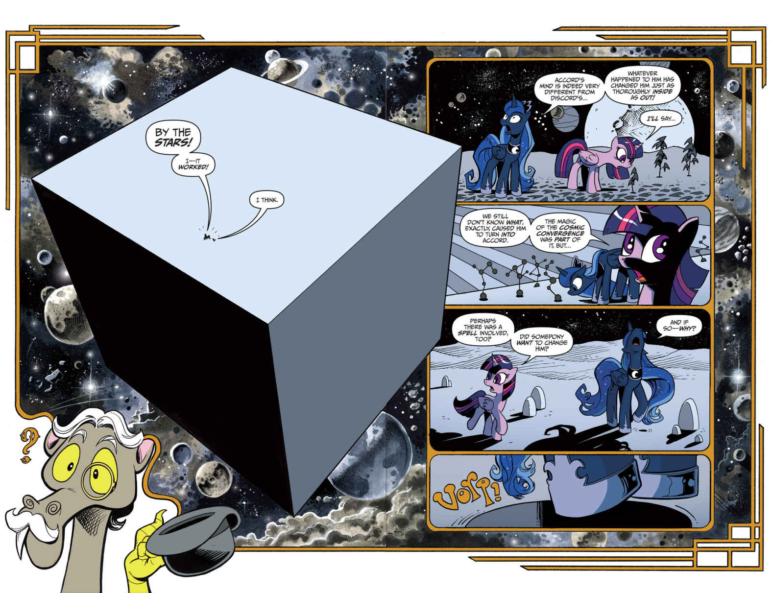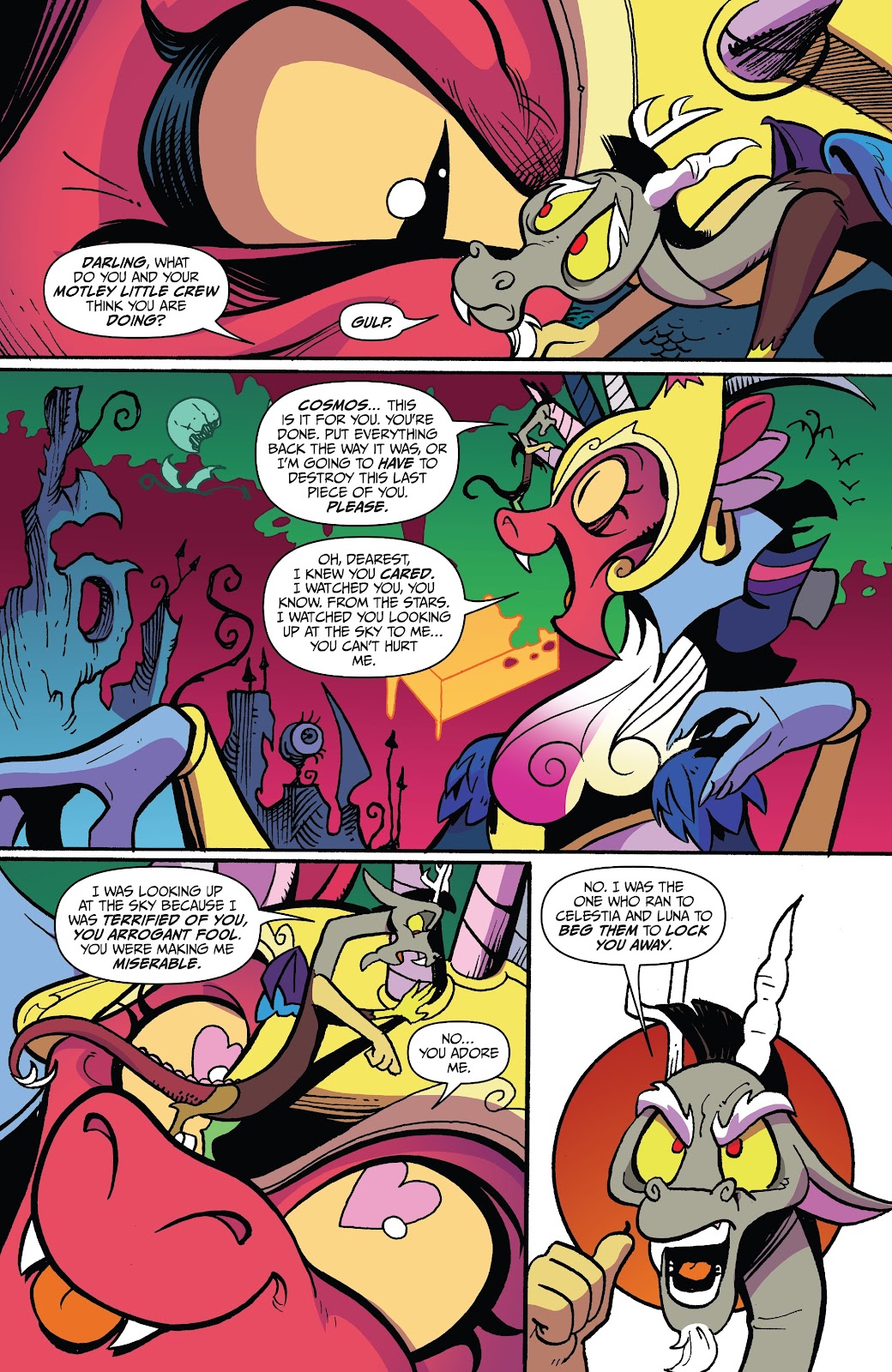 Discord is essentially an enemy of order, not inherently evil. But his chaotic and mischievous ways were a problem for the peaceful denizens of Equestria. This was made even worse when Discord was manipulated by another powerful force. Cosmos, the Lord of Malice. Cosmos unleashed havoc on Equestria and many other universes across reality, with Discord aiding her in his own playful way. But his morals were stronger than Cosmos realized, and she crossed a line when she began trying to kill innocents. Rescuing those endangered by her deeds, Discord betrayed Cosmos and alerted the two mightiest ponies in Equestria to her presence. The Royal Sisters, Celestia and Luna. Cosmos was banished for a long time, and to prevent further pain or the risk of a fool attempting to bring her back, Discord took blame for her crimes. Eventually, he would clash with Celestia and Luna once more, and they would be ready. Wielding the all-powerful Elements of Harmony, Discord was defeated, and turned to stone for a thousand years.